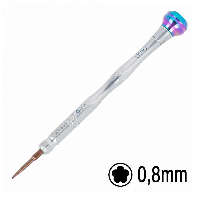 Pentalobe screwdriver for open iphone screws 0,8 . Model: ba-355. Size: 20MM + 115MM. agnetic: with magnetic. Length of Head Tip/Shank: 20 mm / 115 mm. Rotate the Handle: Yes. Type: Mini Magnetic Precision Screwdriver Set. GW: 0.2 KG